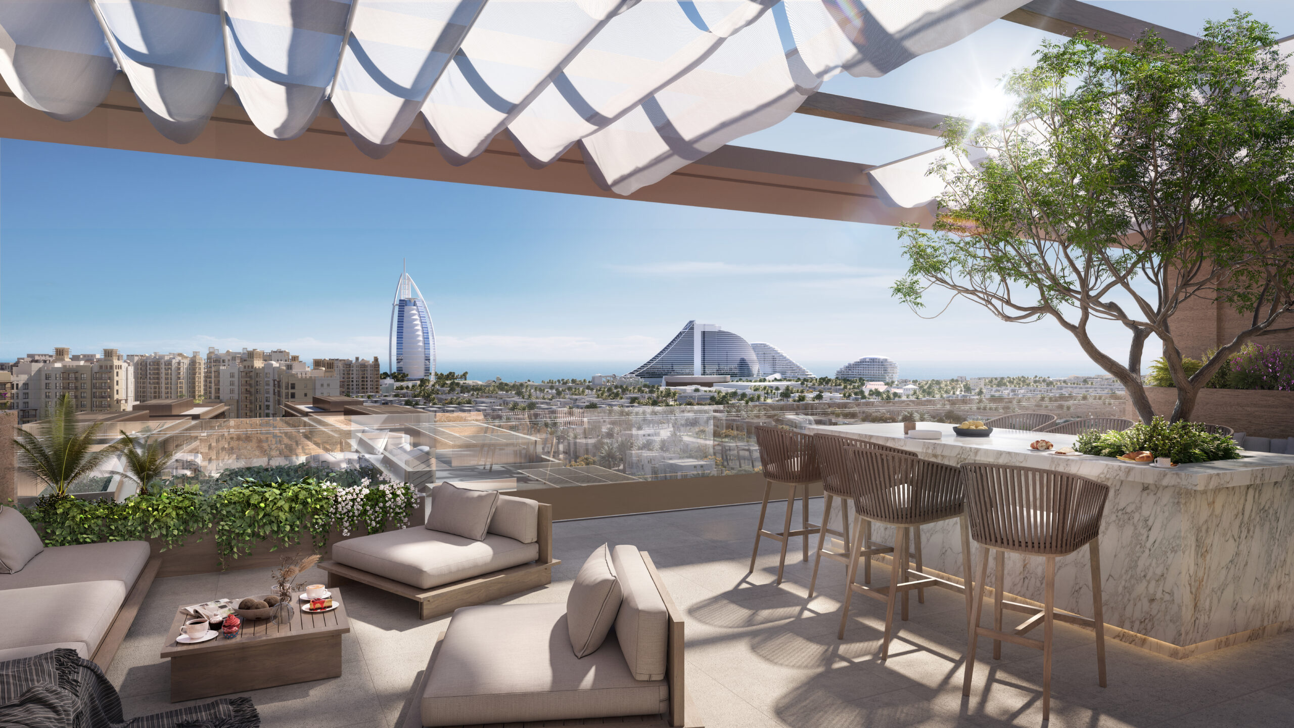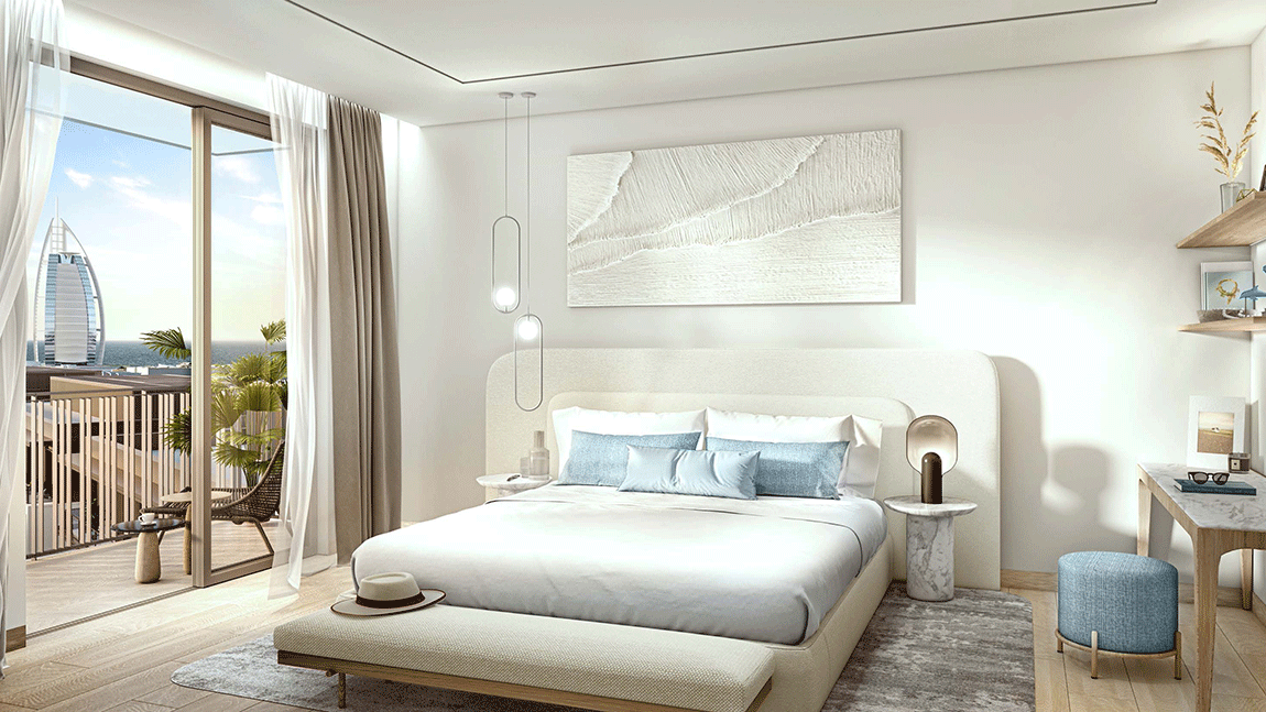 Each residence presents a contemporary interpretation of traditional Arabian architecture, combining clean lines with warm tones and premium finishes. Expansive floor-to-ceiling windows frame breathtaking views of Madinat Jumeirah, Burj Al Arab, and the Jumeirah Beach coastline, filling interiors with natural light and a sense of openness.