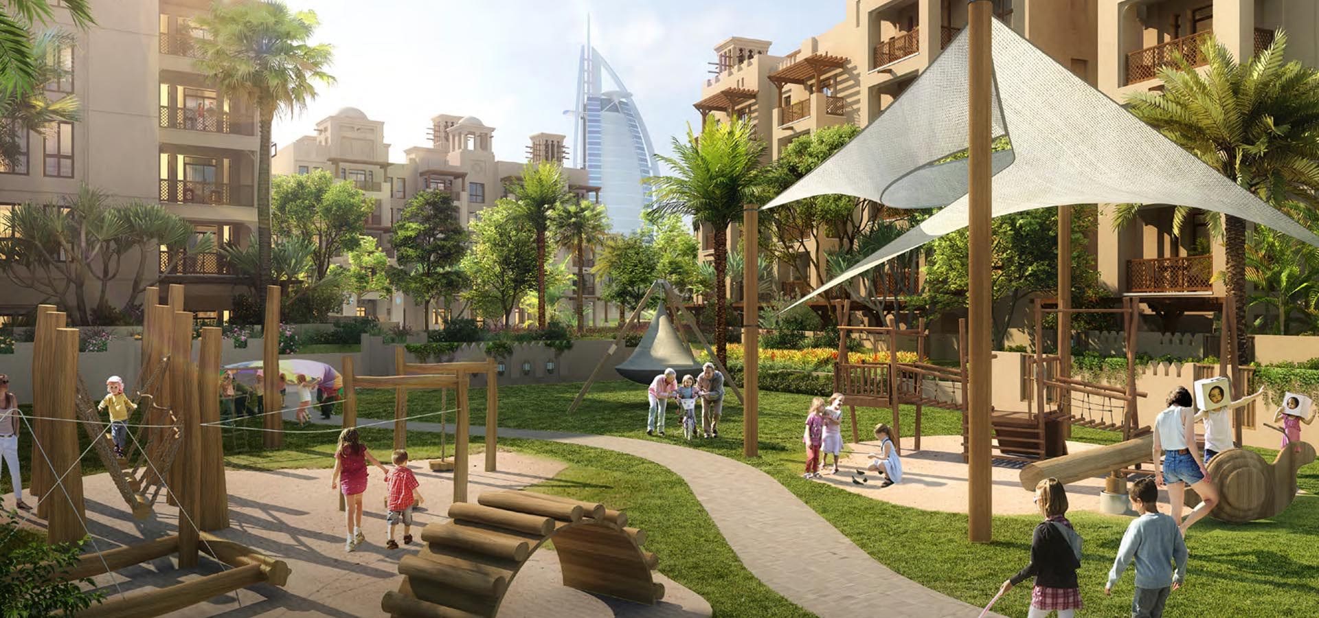The result is a calm, walkable neighborhood that feels like a natural extension of the Madinat Jumeirah resort, offering a safe and serene environment where children can play and neighbors can connect in beautiful communal courtyards.
